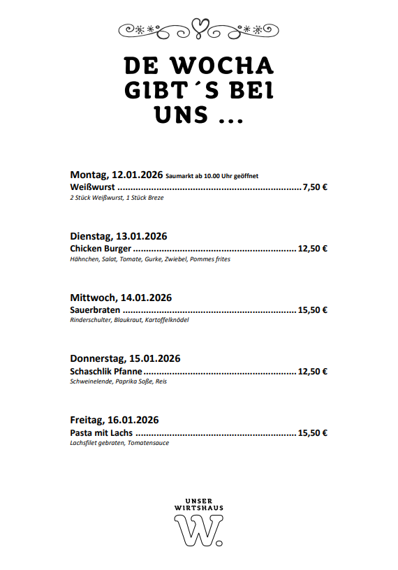 Aktuelles von Unser Wirtshaus Öffnungszeiten an den Feiertagenweiter Öffnungszeiten an den Feiertagen Wochenkarteweiter Wochenkarte Mia suchen Di!weiter Mia suchen Di! Winterkarte!weiter Winterkarte! Mia suchen Di!weiter Mia suchen Di! Teilnahmebedingungen für Gewinnspieleweiter Teilnahmebedingungen für Gewinnspiele